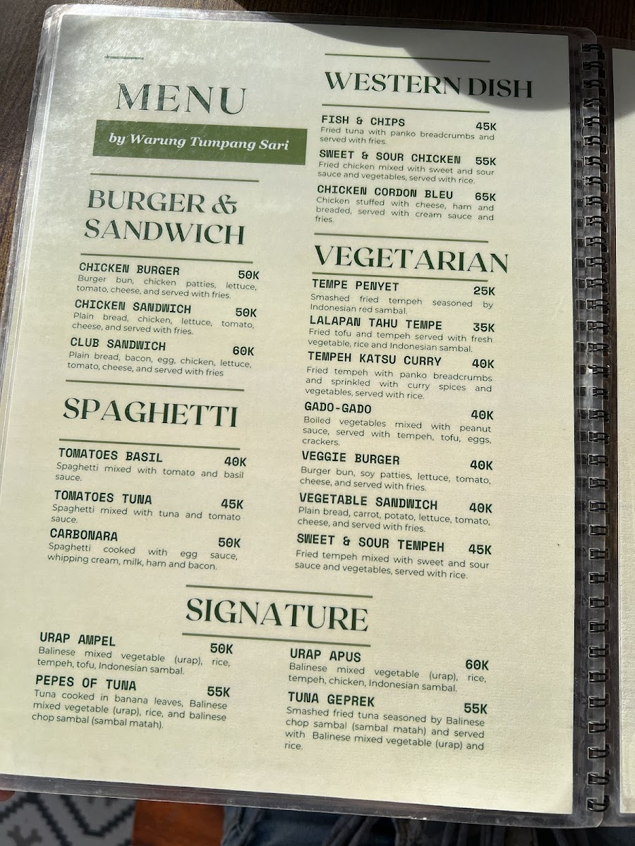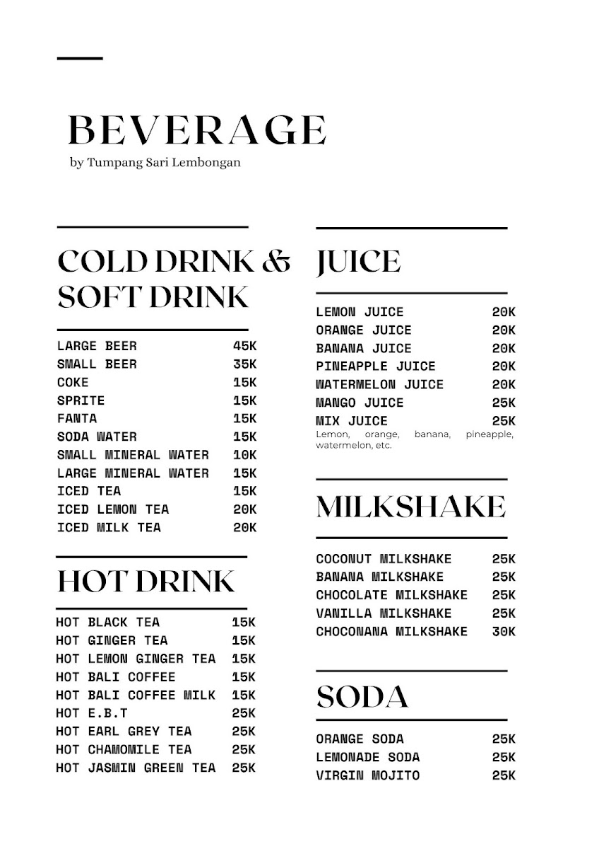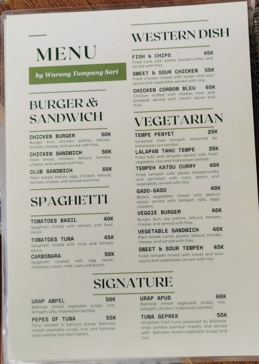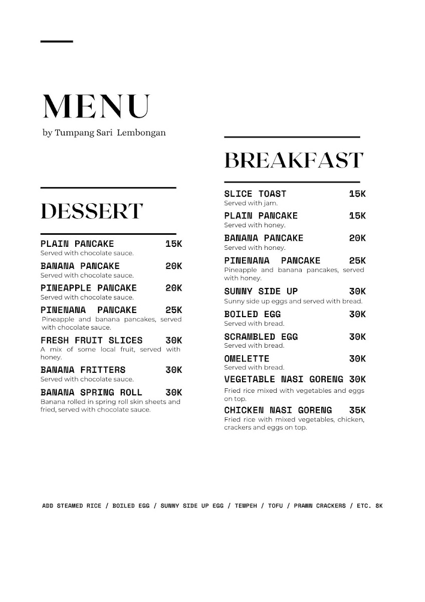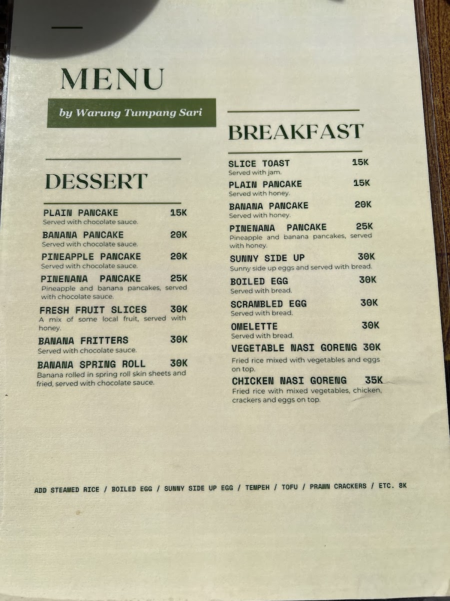 The menu offers a variety of food and drink options suitable for different times of the day, including breakfast, lunch, and dinner. It features a mix of local Indonesian dishes alongside familiar international items, allowing for casual dining and quick ordering.