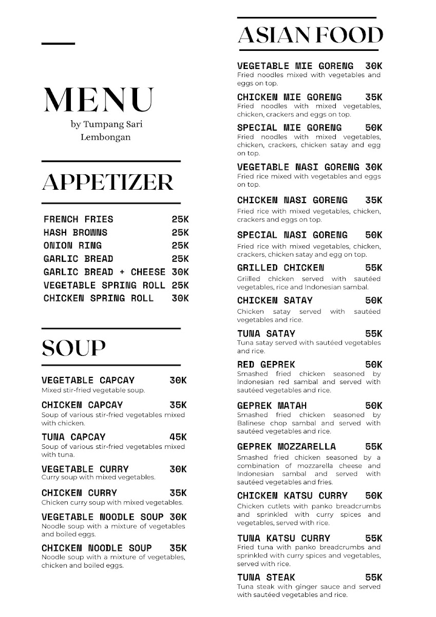 - Main Dishes: Options such as various tuna preparations including pepes, steak, satay, and katsu curry provide a focus on seafood. Other main courses include sweet and sour chicken, spaghetti Napolitana, and club sandwiches.